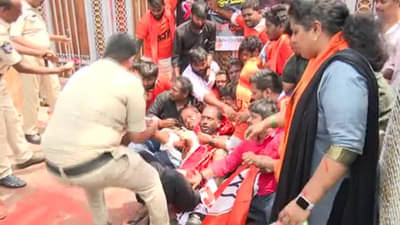గుంటూరు జిల్లా తాడేపల్లిలో వైసీపీ అధ్యక్షుడు జగన్ ఇంటి వద్ద ఉద్రిక్తత చోటు చేసుకుంది. తిరుమల ప్రసాదంలో కల్తీ నెయ్యి వినియోగాన్ని ఖండిస్తూ బీజేవైఎం కార్యకర్తలు ఆందోళన చేపట్టారు. జగన్కు వ్యతిరేకంగా నినాదాలు చేస్తూ నిరసన తెలిపారు. పోలీసులు వారిని అదుపులోకి తీసుకున్నారు.