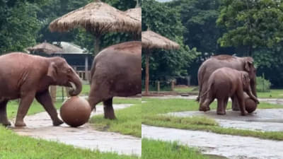 సోషల్ మీడియాలో ఎన్నో రకాల వీడియోలు వైరల్ అవుతుంటాయి. వాటిలో కొన్ని షాకింగ్గా ఉంటే, మరికొన్ని ఆశ్చర్యపోయేలా ఉంటాయి. ఇంకొన్ని నడుపుబ్బ నవ్వుకునేలా చేస్తాయి. ఇక జంతువులకు సంబంధించి ఫన్నీ వీడియోలు కూడా తరచూ వైరల్ అవుతుంటాయి. అలాంటిదే ఈ వీడియో కూడా. థాయ్లాండ్లోని ఎలిఫెంట్ న్యాచురల్ పార్క్లో తేలికపాటి జల్లులు కురుస్తుండగా, ఓ పిల్ల ఏనుగు ఫుట్ బాల్ ఆడుతోంది. ముందరి కాళ్లతో బాల్ను తన్నుతూ.. పక్కనే ఉన్న తల్లి ఏనుగు చుట్టూ తిరుగుతూ అమ్మను కూడా తనతో ఆడాలని కోరుతుంది.. అయినప్పటికీ ఆ తల్లి ఏనుగు పట్టించుకోలేదు. ఇంతలో బాల్ నీటి గుంటలోకి వెళ్లి పడింది. అయినా ఆగలేదు..ఆ గున్న ఏనుగు.. నీటి గుంటలోకి దిగి మరీ మరి ఎంజాయ్ చేస్తూ ఆడింది. ఈ వీడియోను ఓ ఇన్స్టాగ్రామ్ యూజర్ షేర్ చేయగా, ఇంటర్నెట్లో విపరీతంగా వైరల్ అవుతోంది.