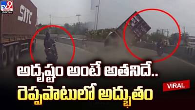 టైం బాలేకపోతే తాడు కూడా పామై కరుస్తుంది అంటారు… అలాగే టైం బాగుంటే ఎంత పెద్ద ప్రమాదం నుంచైనా ఇట్టే తప్పించుకోగలము. అలా పెను ప్రమాదం నుంచి తప్పించుకునే వారినే అదృవంతులు అంటుంటాం. అందుకు ఉదాహరణే ఈ వీడియో. ప్రస్తుతం నెట్టింట వైరల్ అవుతోన్న ఈ వీడియోను చూస్తే అలానే అనిపిస్తుంది. ఇంతకీ ఏం జరిగిందంటే.. హైవేపై ఓ వ్యక్తి కారులో వెళుతున్నాడు. అలా వెళ్తూ రోడ్డును తన స్మార్ట్ ఫోన్లో రికార్డు చేయడం ప్రారంభించాడు. అతని కారు ముందు అంతే వేగంగా ఓ భారీ ట్రక్కు దూసుకెళ్తోంది. అదే సమయంలో కారును ఓటర్ టేక్ చేస్తూ ఓ వ్యక్తి బైక్పై దూసుకొచ్చాడు. ట్రక్ని కూడా ఓవర్ టైక్ చేద్దామనుకున్నాడు. అలా వేగంగా ముందుకు వెళ్తున్నాడు. అంతలోనే పెద్ద మలుపు వచ్చింది. లోడుతో వెళ్తున్న ఆ భారీ ట్రక్కును డ్రైవర్ కంట్రోల్ చేయలేకపోయాడు. ట్రక్ కాస్త టర్న్ అవ్వగానే కంటైనర్ కుడివైపు పడింది. సరిగ్గా కంటైనర్ పడుతున్న సమయంలో బైకర్ సడన్ బ్రేక్ వేశాడు. దీంతో క్షణాల్లో ప్రాణాలను కాపాడుకున్నాడు.