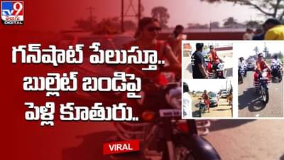 గన్షాట్ పేలుస్తూ.. బుల్లెట్ బండిపై పెళ్లి కూతురు..