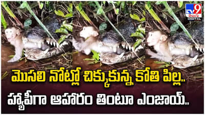 మొసలి నోట్లో చిక్కుకున్న కోతి పిల్ల.. హ్యాపీగా ఆహారం తింటూ ఎంజాయ్