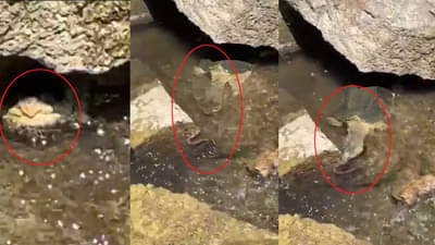 వైరల్ అవుతున్న వీడియోలో ఓ నదిలో రాయి కింద పెద్ద తాబేలు నక్కి ఉంది. దానికి సమీపంలోని మరో రాయి వద్ద పాము ఉంది. తాబేళ్ల సాధారణంగా పామును తిన్న దాఖలాలు లేవు. కానీ ఈ తాబేలు ఎంత ఆకలితో ఉందో ఏమో.. ఆ పామును సెకన్ల వ్యవధిలో.. సమీపించి.. ఒక్కసారిగా గబుక్కున నోటితో అందుకుంది. ఈ షాకింగ్ దృశ్యాలను సోషల్ మీడియాలో వైరల్ అవుతున్నాయి.