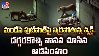 మందేసి ఫుట్పాత్పై నిద్రపోతున్న వ్యక్తి.. దగ్గరకొచ్చి వాసన చూసిన ఆడసింహం