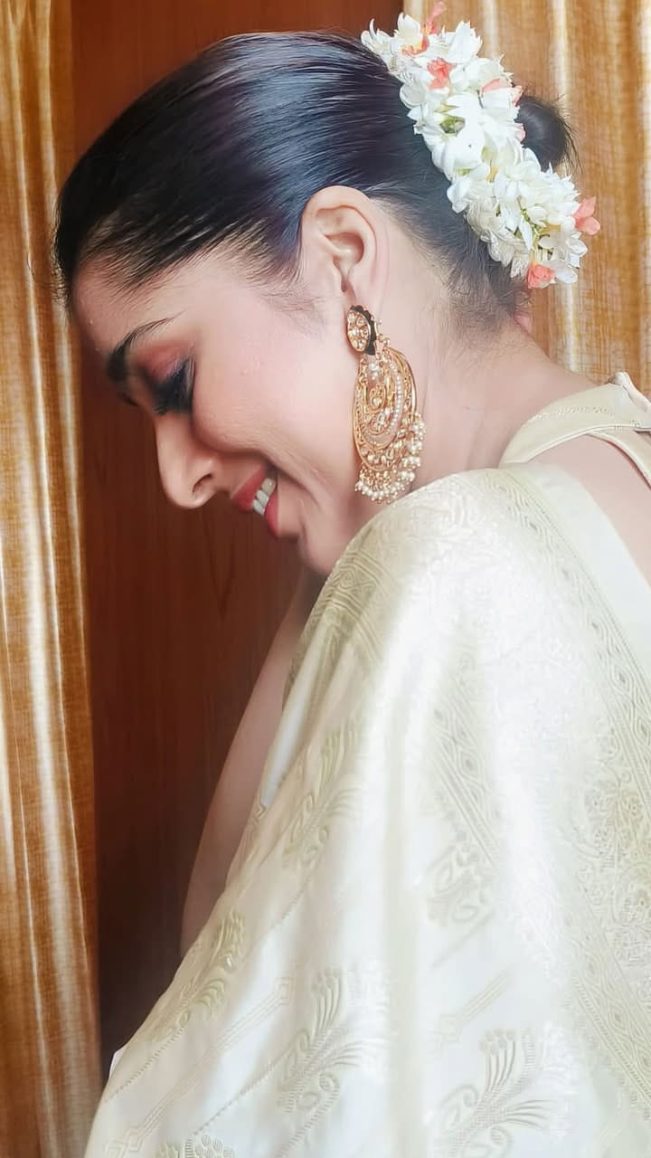 ప్రస్తుతం ఈ ఫొటోస్ నెట్టింట తెగ వైరల్ అవుతున్నాయి. స్లీవ్ లెస్ బ్లౌజ్, కొప్పు చుట్టూ పూలు పెట్టుకొని చాలా బ్యూటీఫుల్గా ఉన్నావంటూ కామెంట్స్ చేస్తున్నారు తమ అభిమానులు.