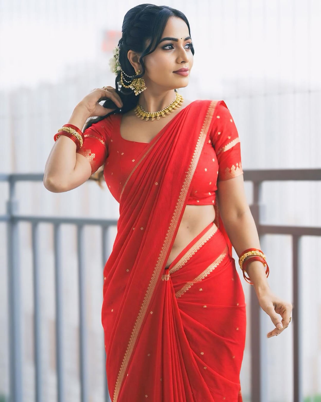 శోభా శెట్టి సోకుల విందు.. ఎర్ర కోకలో కుర్రకారును కవ్విస్తున్న ముద్దుగుమ్మ