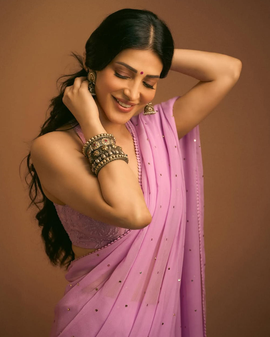 ఈ పింక్ శారీలో శృతి ఎంతో ఎలిగెంట్గా కనిపిస్తున్నారు. చీరపై ఉన్న డిజైన్, దానికి మ్యాచ్ అయ్యే జ్యువెలరీ ఆమె అందాన్ని మరింత రెట్టింపు చేశాయి.