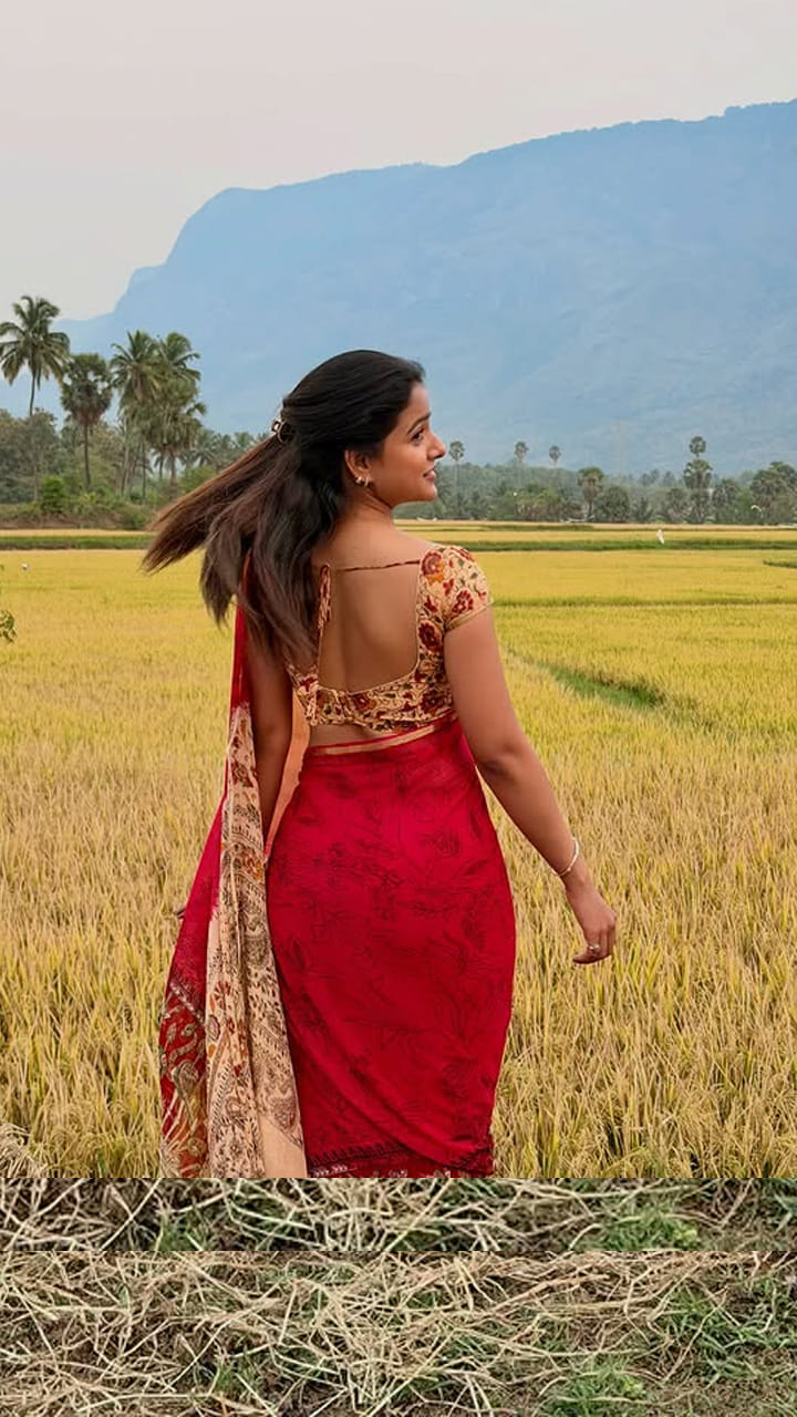 ఇక ఎప్పుడూ సోషల్ మీడియాలో చాలా యాక్టివ్గా ఉండే ఈ చిన్నది తాజాగా, ఎరుపు రంగు చీరలో మెరిసిపోయింది. పొలం గట్లపై కూర్చొని ఫొటోలకు ఫోజులిచ్చింది.