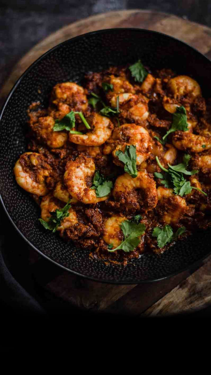 రొయ్యలను పెరుగు, సుగంధ ద్రవ్యాలతో మ్యారినేట్ చేసి, ఆపై గ్రిల్ చేసి, రిచ్ టమోటా ఆధారిత సాస్లో ఉడకబెట్టండి. తయారీ సమయం 30 నిమిషాలు మాత్రమే.