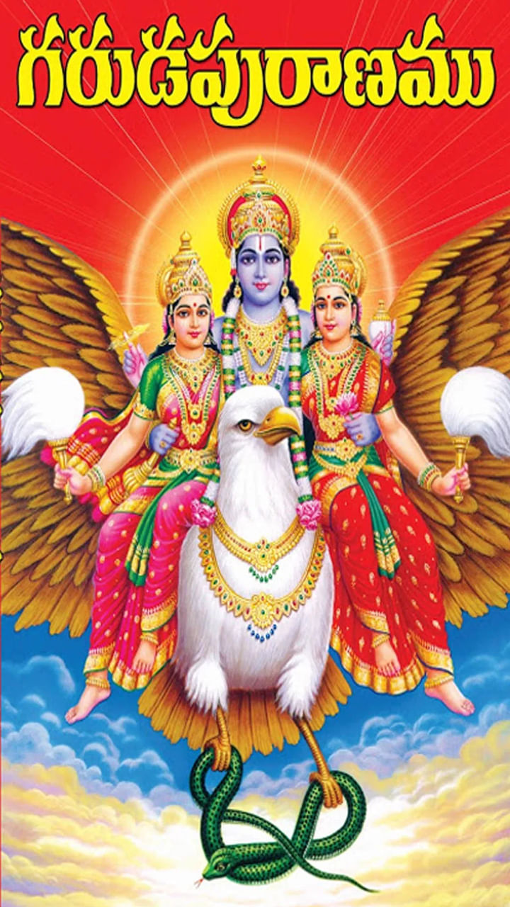 గరుడ పురాణం విష్ణువు, గరుడుడి మధ్య సంభాషణ. ఇది మరణం తరువాత ఆత్మ ప్రయాణం, ఆచారాలు, ఒకరి చర్యల పరిణామాలు వంటి అంశాలను కవర్ చేస్తుంది.