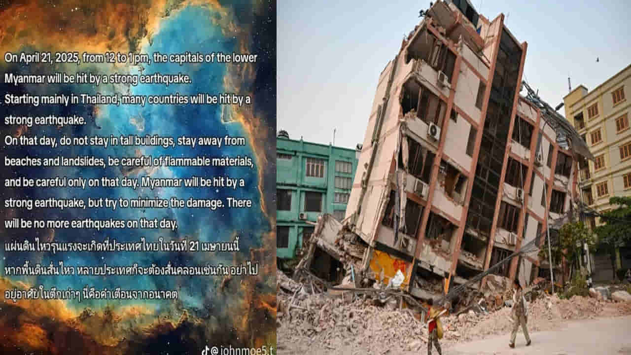 జాన్ మో ది అనే జ్యోతిష్కుడు త్వరలో మయన్మార్లో మరో పెద్ద భూకంపం రాబోతోందని టిక్టాక్లో ఓ పోస్ట్ చేశాడు. ఈ భూకంపం ఏప్రిల్ 21న మయన్మార్లోని ప్రతి నగరాన్ని తాకుతుందని ఆ వీడియోలో హెచ్చరించారు. భూ కంపం వచ్చే ముందే మీరు ఉన్న భవనాలను ఖాళీ చేయాలని.. మీ ఇంట్లో ఉండే విలువైన వస్తువులను మీతో పాటు తీసుకెళ్లాలని వీడియోలో జోతిష్యుడు పేర్కొన్నట్టు తెలుస్తోంది. అయితే మూడు లక్షలకుపైగా ఫాలోవర్స్ ఉన్న ఆ జ్యోతిష్యుడు పోస్ట్ చేసిన వీడియో క్షణాల్లో వైరల్ అయిపోయింది. దీంతో అది నిజమేనని నమ్మిన ప్రజలు తీవ్ర భయాందోళనలకు గురయ్యారు. నిజంగానే ఏప్రిల్ 21 భూకంపం వస్తుందని నమ్మిన కొందరు ప్రజలు వాళ్ల ఇళ్లను వదిలి బయట క్యాంప్లు వేసుకొన్నట్టు ఓ స్థానికుడు తెలిపారు.